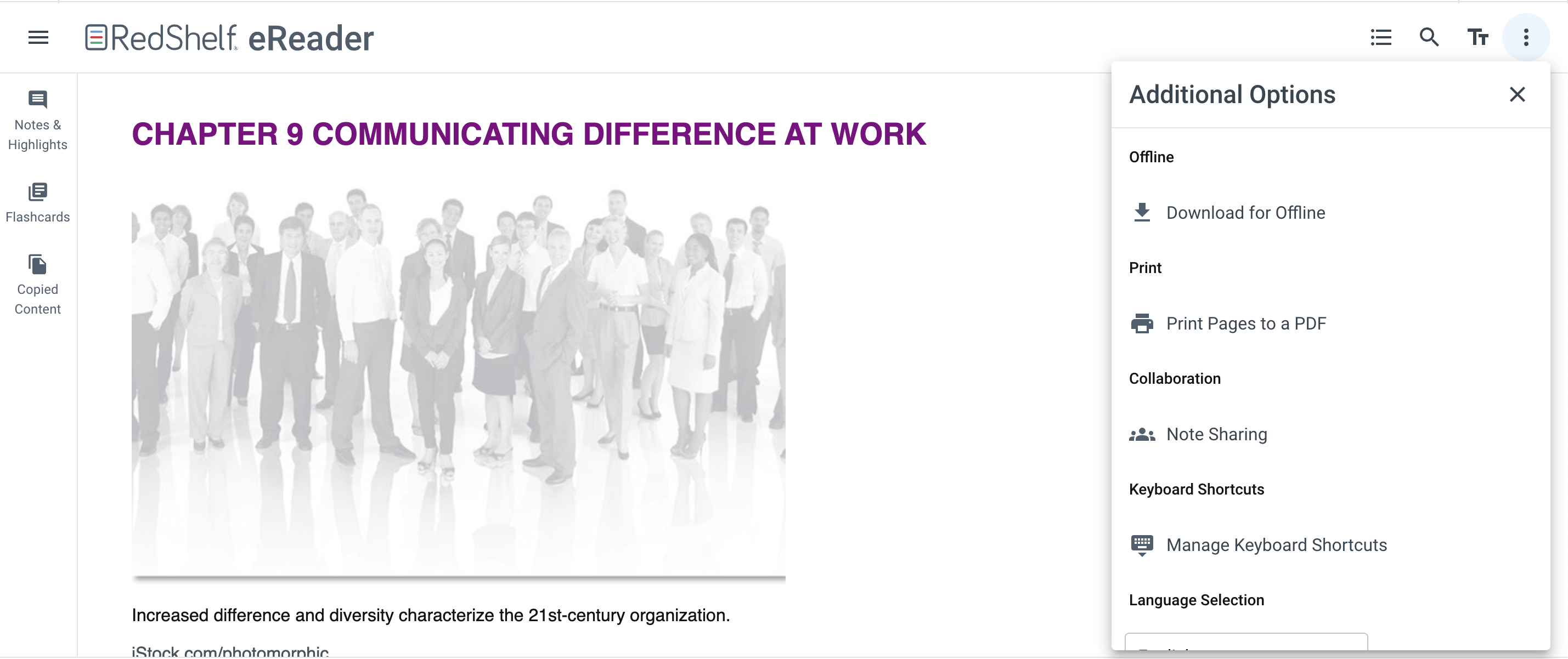 2\) **Learning Tools Drawer**: Contains interactive tools and resources like Notes and Highlights, Flashcards, Copied Content, and Classroom (if applicable), which enhance the digital experience. This drawer is open by default when you open your book.