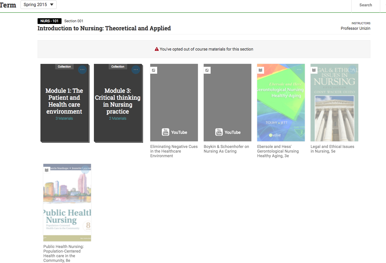 This release contains one user-facing change: The disabling of content in a section which has been opted out of. Any user that has opted out of all content for a section will still be shown the proprietary eText content along with any content that their instructor has uploaded, but the content will be disabled and cannot be accessed. A message indicating opt-out will be displayed, see below example. This functionality was added to support the 2015 amendments to the Higher Education Act.