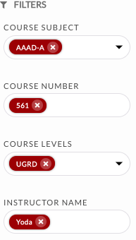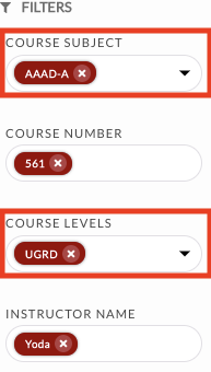 For example, in the filter criteria applied below, the Order Tool will present all Courses whose Course subjects begin with AAAD-A, whose Course number is 561, whose Course level is UGRD, and whose Instructor name is Yoda.