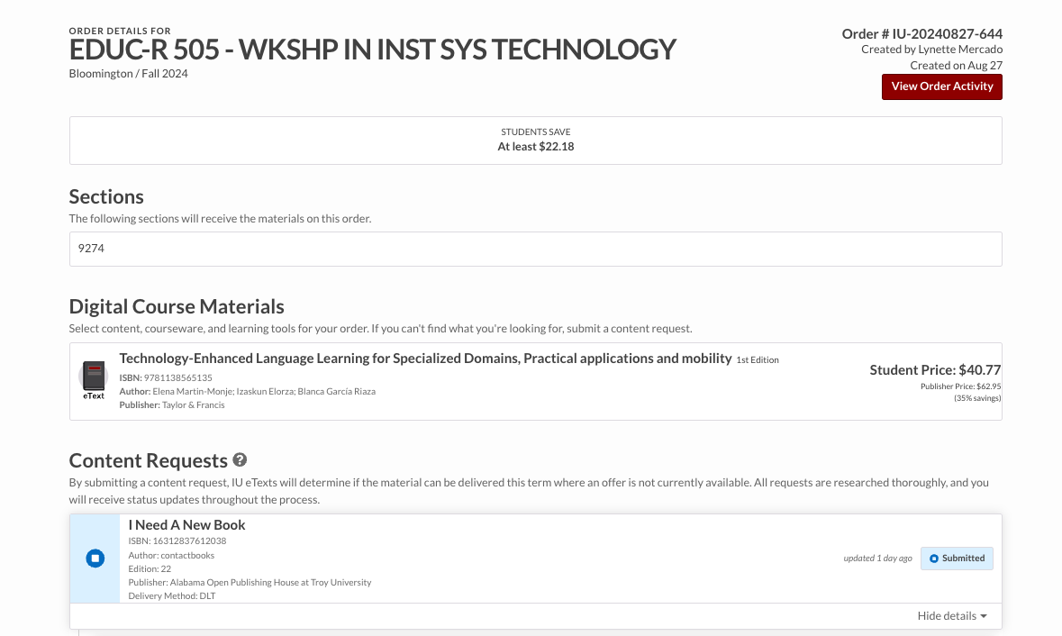 The Order Activity is displayed in chronological order with the most recent events at the top, and includes a timestamp accurate to the local timezone of the user. This option is available to Program Administrators, Course Coordinators, and Instructors for all orders.
