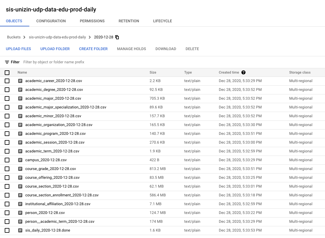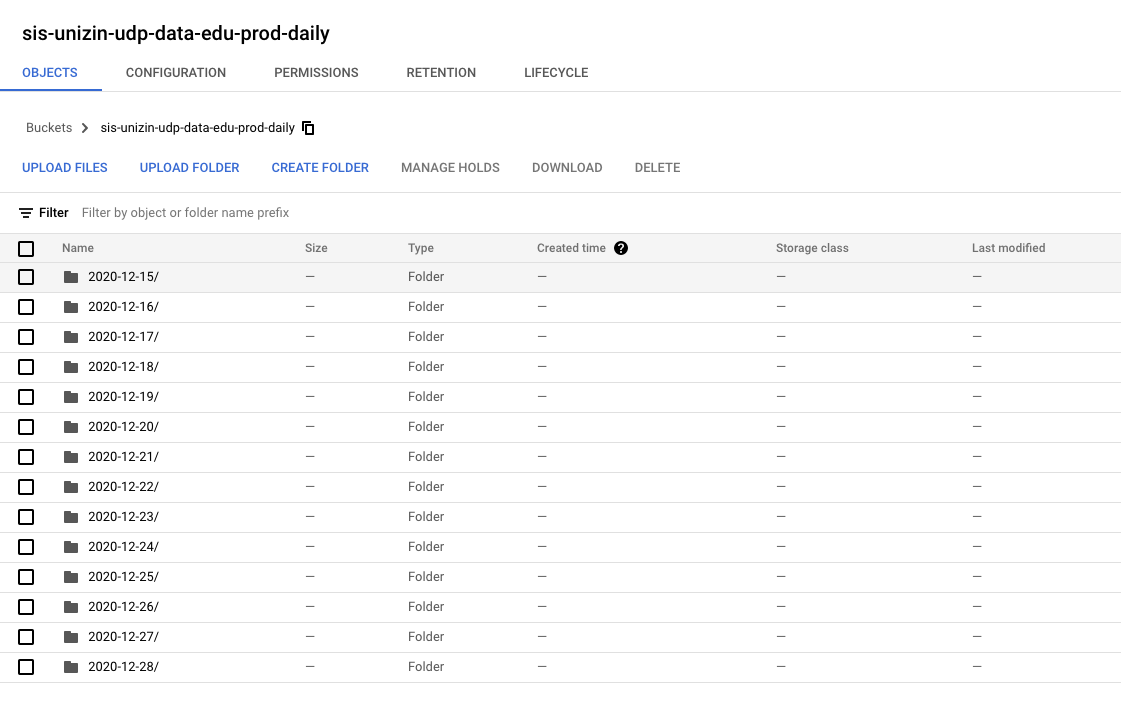In the screenshot below, we see folders that each represent a daily SIS context dataset pushed into a UDP instance. These folders are located in the bucket that is exclusively reserved as the ingress point for SIS context data.