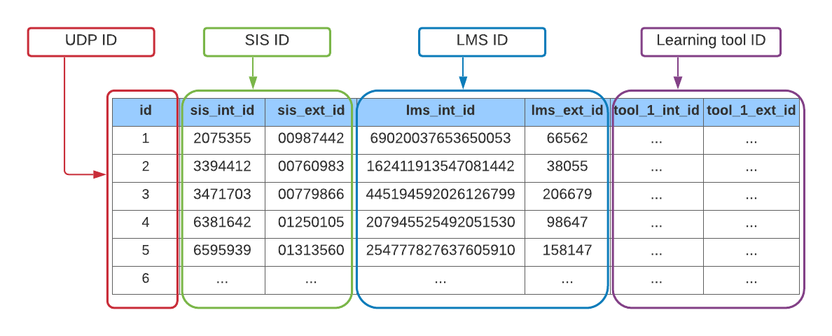 <figure><img src="https://3709019308-files.gitbook.io/~/files/v0/b/gitbook-x-prod.appspot.com/o/spaces%2FKYwtHNGgdPXS3PWAlZUr%2Fuploads%2Fgit-blob-6cb6528a3e6617c5a4c041a3ca459e2d223fc5d2%2F20447990.png?alt=media" alt=""><figcaption><p><em>An example keymap table definition, highlighting that a surrogate identifier (i.e., a UDP ID) maintains relationships with native identifiers from source data systems such as the SIS and LMS</em></p></figcaption></figure>