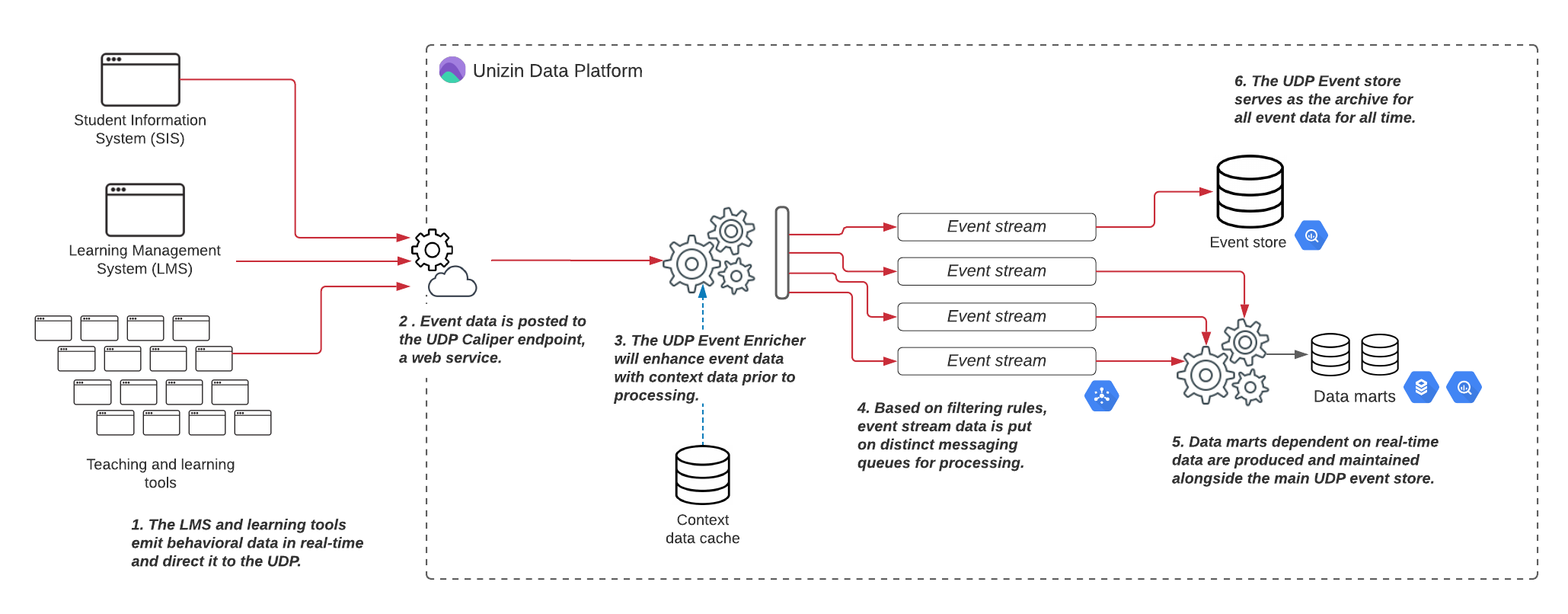 2. [UDP Event enricher](https://resources.unizin.org/products/data-and-analytics/unizin-data-platform/system-overview/event-data-pipeline/udp-event-enricher), which adds cached context data to streaming behavioral data