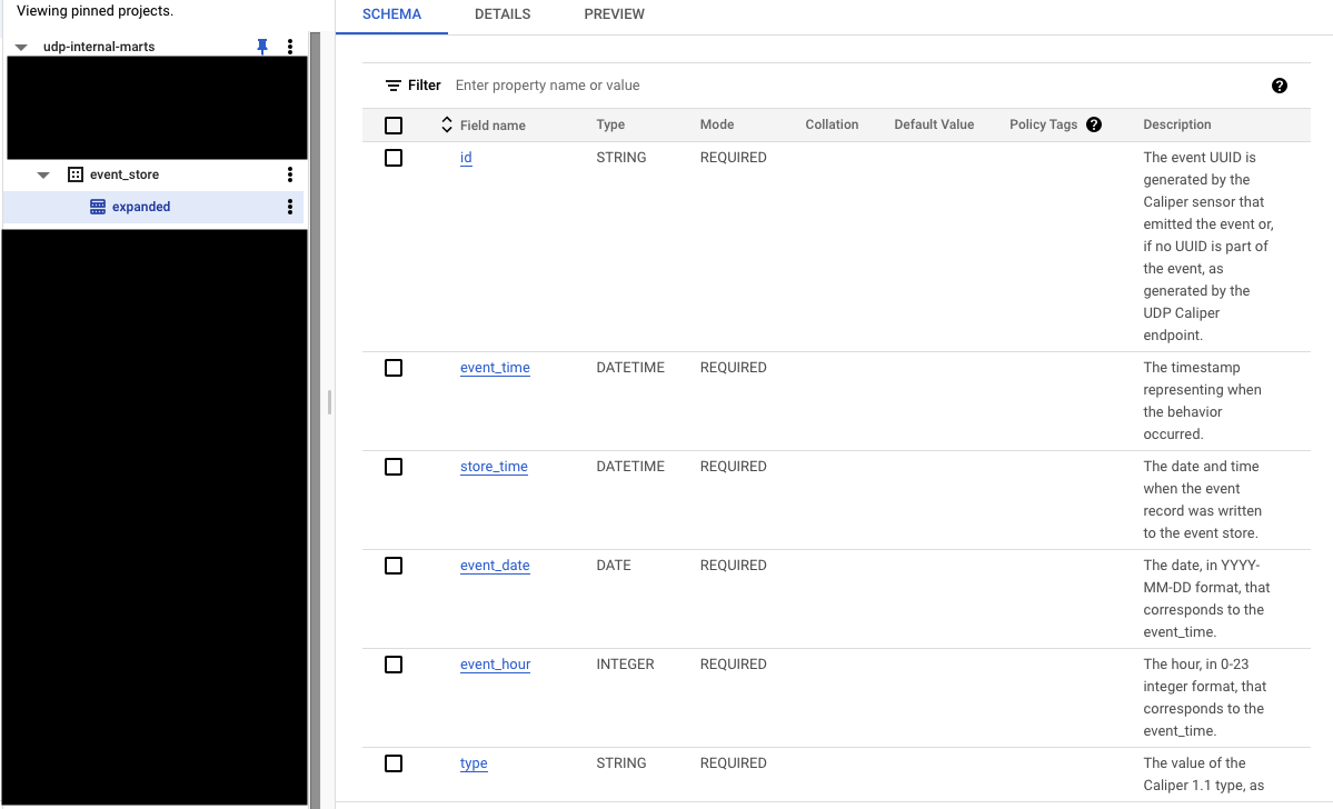 The UDP Event store is implemented in Google BigQuery using a date-partitioned table, called `expanded`. The `expanded` table is located in the `event_store` dataset.